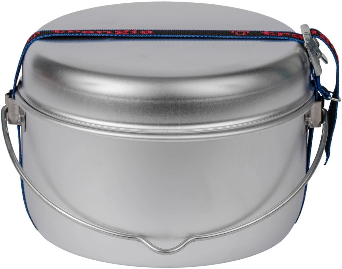 Camping Kochset aus Aluminium mit Kessel, zwei Töpfen, einer Pfanne und einem Gurt. Geeignet für Gas- & Spiritusbrenner.
