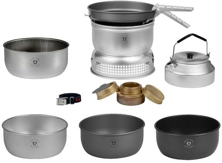 Die Serie 25 umfasst etwas größere Kocher, die für Gruppen von etwa 3-4 Personen geeignet sind. Sie sind ausgezeichnete Familienkocher mit geräumigen Pfannen, einer breiteren Bratpfanne und einem größeren Wasserkocher. Mit den Stützen in der angehobenen Position kann der Kocher mit großen Billies aus dem übrigen Trangia-Sortiment verwendet werden.