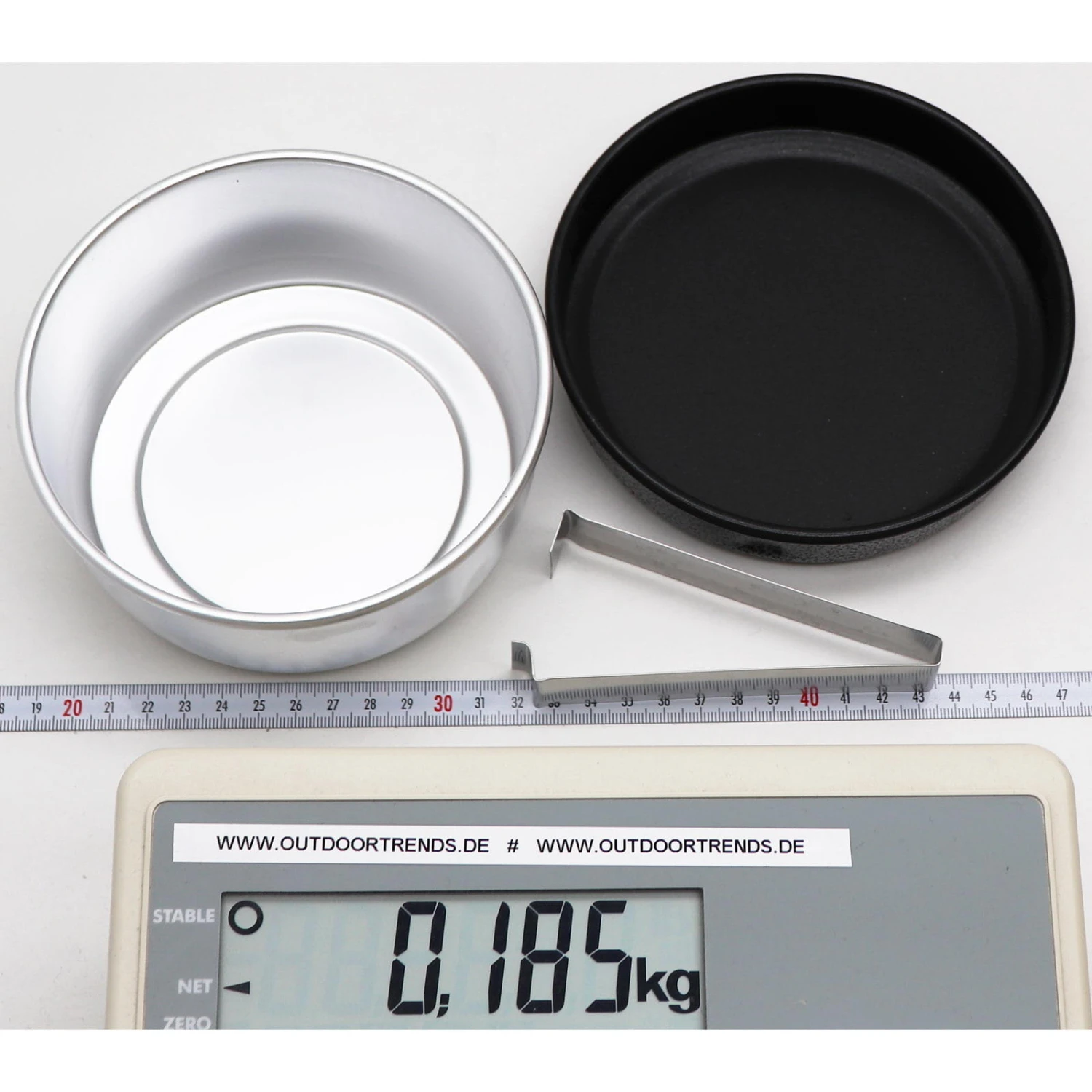 Ausstattung: 0,8 Liter Topf aus Aluminium, Bratpfanne (kann als Deckel benutzt werden) 15 cm im Durchmesser aus Non-stick, Zange