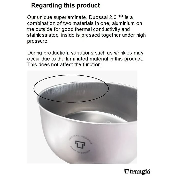 ist Trangia’s einzigartiges Superlaminat. Dieses Laminat ist eine perfekte Kombination von zwei Materialien in einem, die unter hohem Druck zusammengepresst werden. Außen Aluminium für gute Wärmeleitfähigkeit und innen Edelstahl, wodurch das Kochgeschirr kratzfest und leicht zu reinigen sind. Duossal Töpfe sind langlebig und erwärmen sich schnell. Die Materialstärke beträgt insgesamt 0,8 mm. Edelstahl 0,3 / Aluminium 0,5 mm.