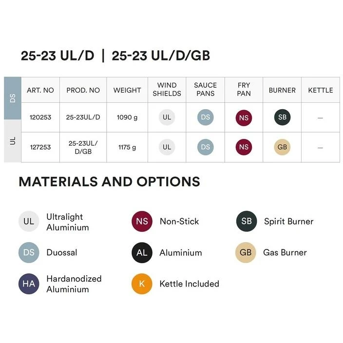 Die Serie 25 umfasst etwas größere Kocher, die für Gruppen von etwa 3-4 Personen geeignet sind. Sie sind ausgezeichnete Familienkocher mit geräumigen Kochtöpfen, einer breiteren Bratpfanne und einem größeren Wasserkocher. Wenn die Stützen hochgeklappt sind, kann der Kocher mit großen Billies aus dem übrigen Trangia-Sortiment verwendet werden.