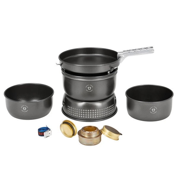 Original Trangia Spiritus-Brenner, Aluminium-Untergestell, Aluminium-Windschutz mit Topfhalterung, Brenner, 2 Non-Stick-Töpfe mit 1,5 und 1,75 Liter Volumen, Non-Stick-Pfanne 220 mm Ø, Griffzange, Spanngurt.