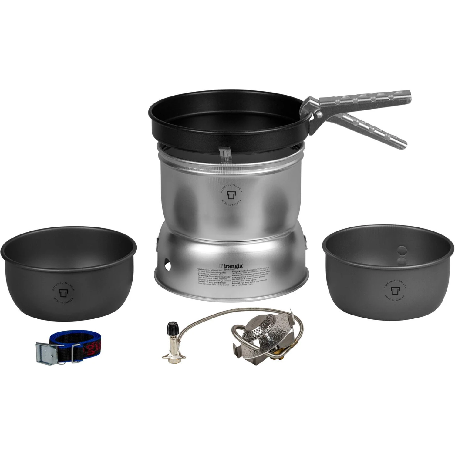 Ausstattung: 1 x Topf 1,0 Liter mit Maßeinteilung (HA Aluminium), 1 x Topf 1,0 Liter ohne Maßeinteilung (HA Aluminium), 1 x Bratpfanne 18 cm Durchmesser (Non-Stick), oberer Windschutz (UL Aluminium), unterer Windschutz (UL Aluminium), Gas Brenner, Zange, Riemen